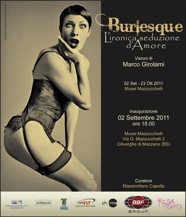 La mostra Burlesque, l’Ironica Seduzione d’Amore aperta al pubblico dal 3 settembre al 23 ottobre 2011, inaugura ufficialmente gli eventi collaterali per l’apertura della Biennale Internazionale dell’Arte Contemporanea a Brescia e viene allestita all’interno della settecentesca Sala delle Colonne dei Musei, accanto a una selezione di biancheria intima femminile databile tra l’inizio del Novecento e gli anni sessanta. 23 scatti realizzati dal fotografo internazionale Marco Girolami tra giugno e luglio 2011 in 20 diverse locations per immortalare il sapore e il fascino del mondo artistico e giocoso del Burlesque.