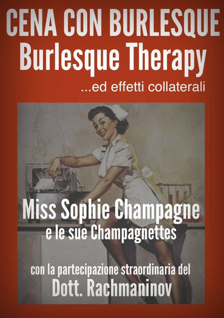 Il nuovo spettacolo “Burlesque Therapy, ed effetti collaterali” nella versione divisa in tre tempi per cena con burlesque, porterà in scena divertenti sketch e numeri burlesque con Miss Sophie Champagne e le sue Champagnettes.