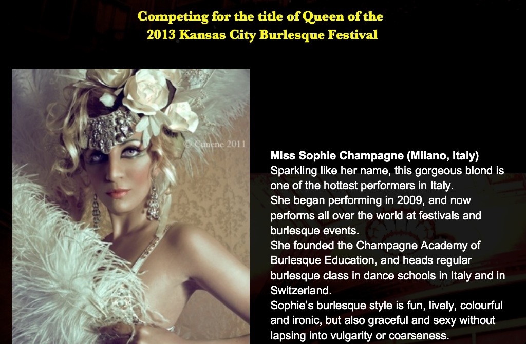 É la seconda volta nel giro di due mesi, la performer burlesque italiana Miss Sophie Champagne vola di nuovo negli Stati Uniti per partecipare ad un’altro prestigioso festival, il Kansas City Burlesque Festival 2013.