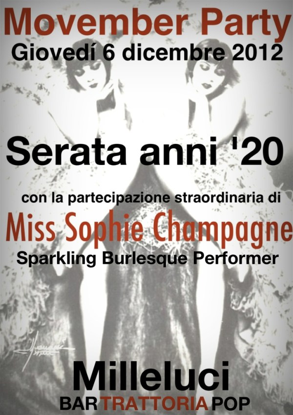 Una serata in stile anni ’20 con spettacolo di burlesque, giovedí 6 dicembre al Milleluci, via Rosolino Pilo 7, il cui ricavato sarà devoluto per la causa.