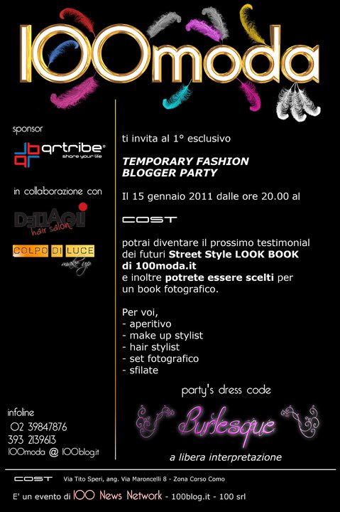 Temporary Fashion Blogger Party Sabato 15 Gennaio Miss Sophie Champagne insieme ad altre performer porterà il Burlesque all’esclusivissimo party organizzato da 100Moda al Cost di Milano, evento da non perdere!! Condividi: Condividi su Facebook (Si apre in una nuova finestra) Facebook Condividi su X (Si apre in una nuova finestra) X Condividi su Pinterest (Si apre in una nuova finestra) Pinterest Condividi su Tumblr (Si apre in una nuova finestra) Tumblr Invia un link a un amico via e-mail (Si apre in una nuova finestra) E-mail Mi piace Caricamento... 14 gennaio 2011 0